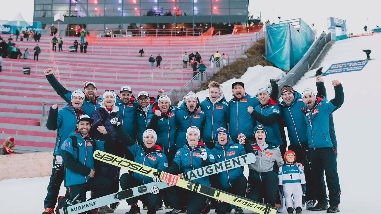 Das österreichische Skisprungteam jubelt über den Erfolg.