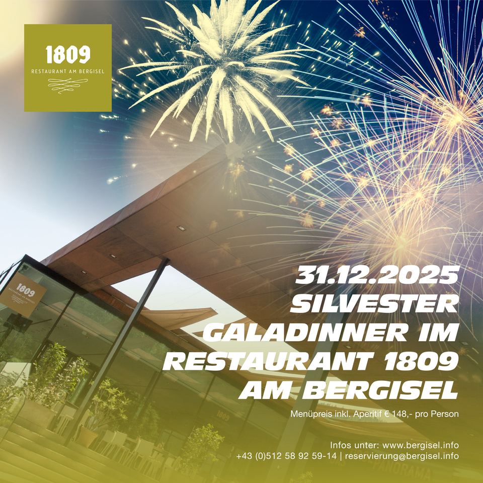 Das Silvester Galadinner beginnt um 19:00 Uhr mit einem Aperitif im Restaurant 1809 am Bergisel. Zur Fixierung ist eine Anzahlung in Höhe des Menüpreises erforderlich. Die Verrechnung der Getränke erfolgt vor Ort nach Verbrauch.